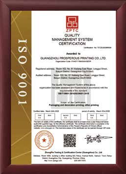 GUANGZHOU PROSPEROUS PRINTING CO.,LTD. mainly produces all kinds of paper products packaging boxes, paper bags, self-adhesive products, packaging products are widely used in cosmetics, perfume, gifts, toothpaste, health care products, tea, wine, hand jewelry and other product packaging, research and development, production, service in one of the professional paper packaging manufacturers. In May 2024, it was certified as a strength factory by INTERTEK professional international organization.